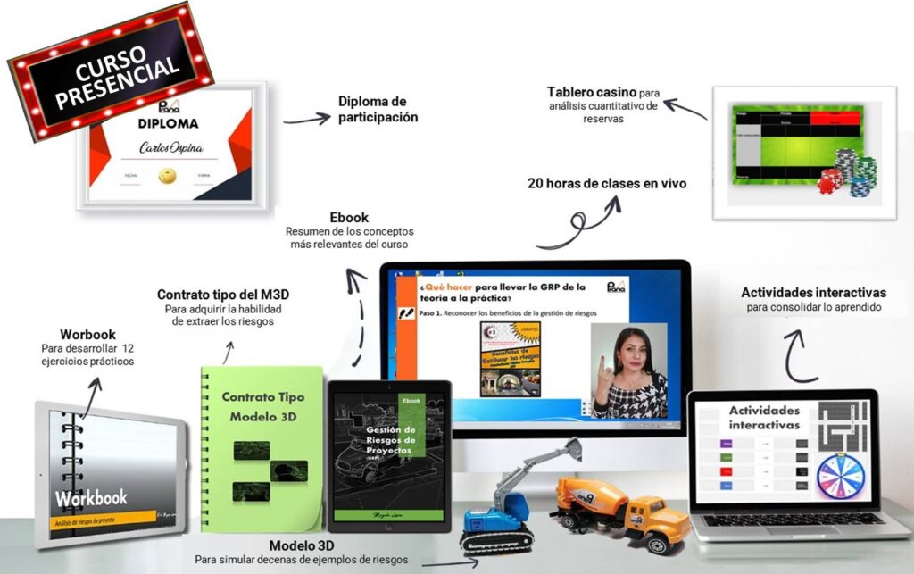 Simulamos situaciones reales a las que te enfrentas al momento de extraer los riesgos del contrato, momentos donde surgen las dudas, pero con la oportunidad de resolverlas inmediatamente. El objetivo es ayudarte a desarrollar la habilidad de identificar los riesgos y diferenciarlos de las causas y los efectos, para luego vivir la experiencia de planear acciones de respuesta.